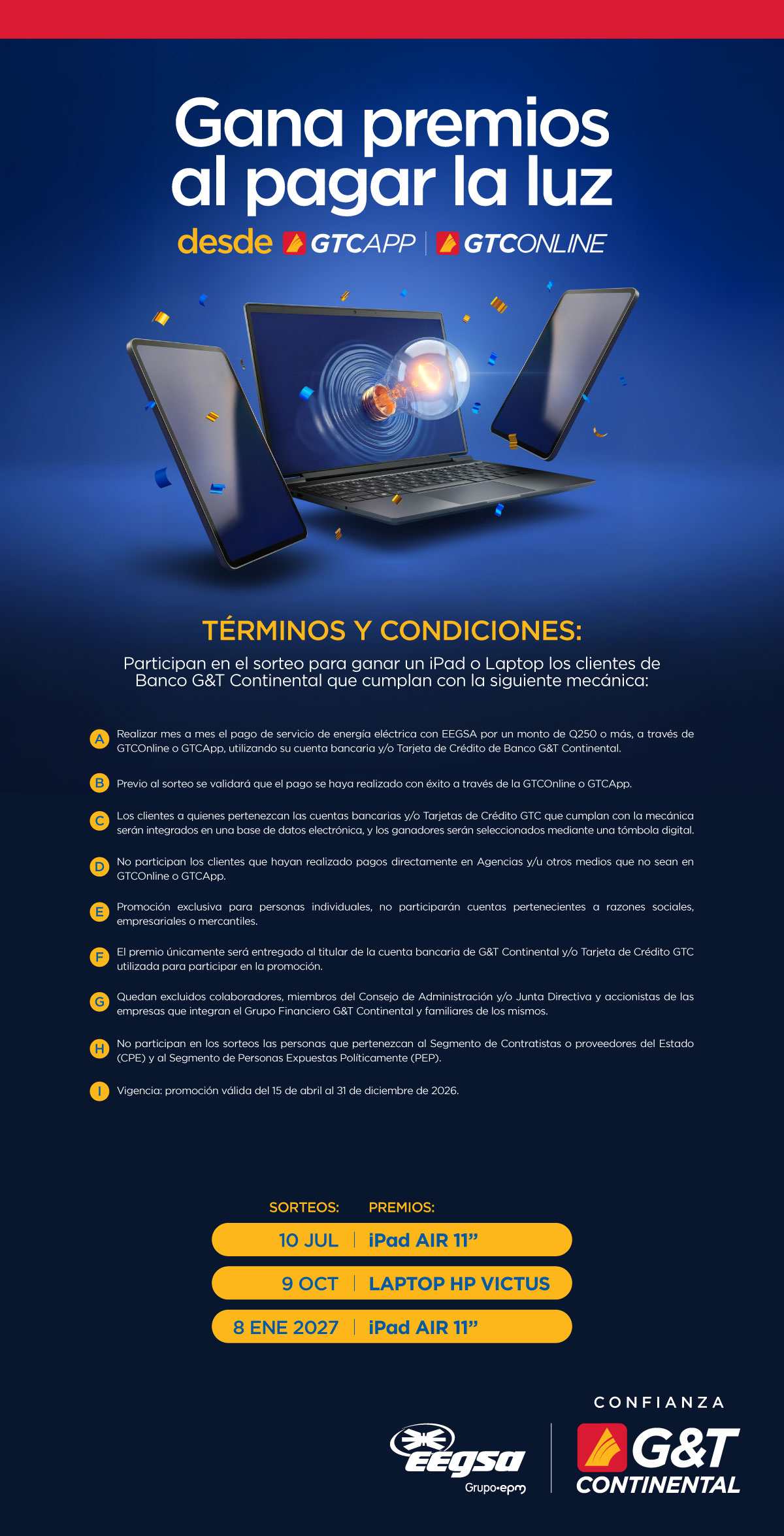 Gana un iPad o una laptop realizando tus pagos de luz EEGSA por un monto de Q250 o más, por medio de una cuenta bancaria y/o tarjeta de crédito, al pagar desde tu GTCApp o GTCOnline.